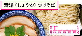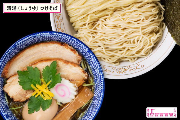 煮干しの優しさが伝わるスープに食べる楽しみを考えた細麺と平打ち麺の食感の異なる2種類麺で食べる清湯(しょうゆ)つけそばは、イベントとは思えない手の込んだ逸品。