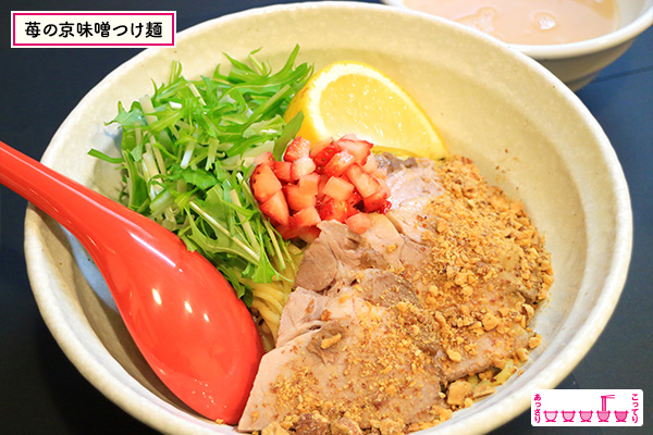 濃厚な鶏白湯にあさりの旨味を加えたスープは、トッピングの生姜ジュレがアクセントに。まさに至福の一杯♡さらに遊び心たっぷりのつけ麺は、季節感にもこだわり国産のいちごを使用!西京味噌のフルーティーなつけダレにクミンオイルを絡めた麺の相性は抜群!斬新な見た目とは裏腹に、期待を上回る美味しさに病みつきになるはず!