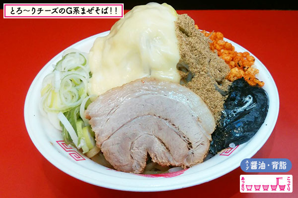そのボリュームに衝撃を受け、一口食べた瞬間に脳裏に焼き付く"G系ラーメン"。お客様一人一人が無料でデコレーショントッピングする楽しみを考えた結果『インスタ映え』するラーメンが完成。マヨネーズを竹炭でブレンドした"ブラマヨ"は女子博用に開発。世界に一つだけMYラーメンを作ってInstagramに投稿しちゃおぅ!とろ~りチーズと背脂の旨みに酔いしれて。
