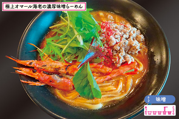 オマール海老を寸胴に30kgも投入し味噌と合わせた"濃厚海老ラーメン"。海老が丸ごと1匹乗ったフォトジェニックなルックスには思わず笑みがこぼれます。女子博のために老舗製麺所 "浅草開化楼"の不死鳥カラス氏と共同開発した平打ち麺は、パスタにも使われるセモリナ粉を配合しながらもラーメン感にこだわった極上麺です!