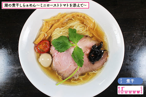平子、背黒、いりこをたっぷりと使用し丁寧に仕上げたキラキラ黄金スープは高級料亭のような味わい♡しっとり柔らかな豚肩ロースは肉本来の味をちゃんと楽しめるように調理されており、ロースプチトマトは甘く、海苔を崩すと一気に磯の風味が広がります。香りやインスタ映えにもこだわった、ありそうでなかったコク深い煮干しらぁめんは必食です!