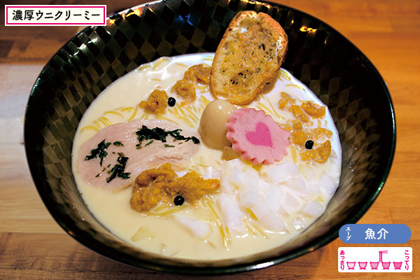 仙台の神と呼ばれる″らー神 心温″が東京初上陸!今回は店舗の限定麺の中でも大大大人気だった"濃厚ウニクリーミー"を女子博用にブラッシュアップ。雲丹をそのまま食べているような生搾り感覚の贅沢スープには、豆乳を加えよりクリーミーに♡しそが香る鶏チャーシューもお口直しにピッタリ!ハートのNARUTOも珍しく大満足の一杯です!