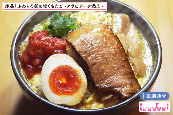 名古屋で半世紀以上愛されているご当地ラーメン『玉子とじ』が"薬膳スープ"と合わさるとこんなにも優しくなる♪ 漢方生薬の臭みが一切なく思わず飲み干してしまう健康スープは名古屋嬢にも大人気♡今回は女子博用に特別トッピングのアラビアータをご用意。後半は味変させて楽しく食べてネ!私の地元の自慢ラーメン、絶対に食べてってちょ~!