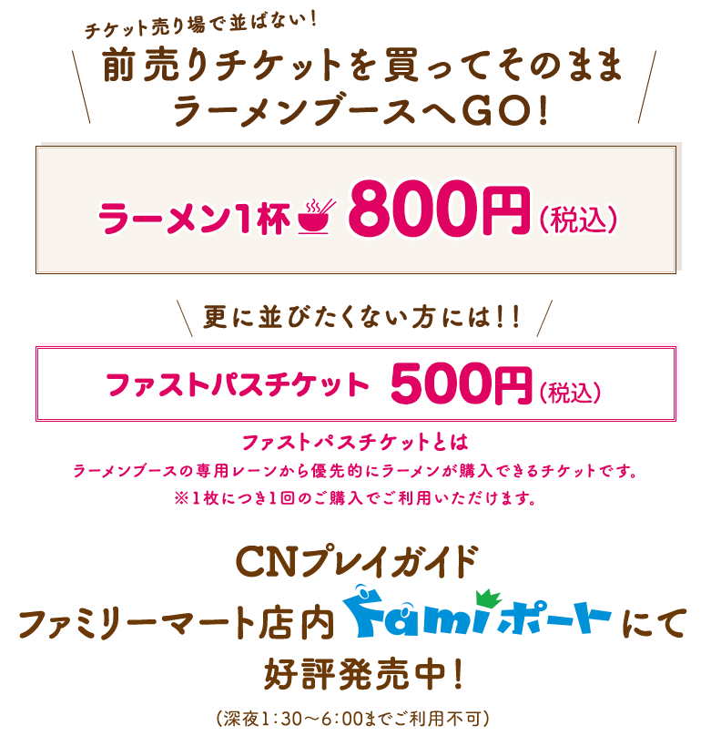 チケット(食券)はラーメンブースでは販売しておりませんのでチケットステーションにてご購入の上、ラーメンブースの列にお並びください。