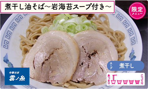 ラーメンウォーカー山形 2019 新店部門第1位に輝いた「中華そば雲ノ糸」が遂に静岡にやってきます!特別に開発してくれた限定麺は、岩海苔スープ付きが嬉しい『煮干し油そば』。そのまま食べてもよし!麺を岩海苔スープに絡めて食べてもよし!と、油そば&つけ麺の良いとこ取りを実現◎季節毎に厳選する数種類の煮干し油は甘じょっぱくてクセになる逸品。ラーメン大国・山形から圧倒的に旨い限定ラーメンをお届けします♪