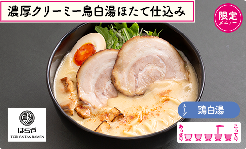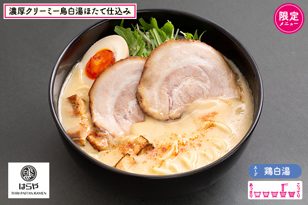 東海地区有名YouTuber・358TVさんの番組にも出演するなど注目を集めている私の地元・愛知県一宮の人気ラーメン店♡鳥白湯×ホタテの、濃厚だけど優しいスープはコラーゲンたっぷりなんです!大判の豚チャーシュー2枚と、はらや独自の鶏のサイコロチャーシュー、とろ~り味玉もついた贅沢な限定麺が出来ました♪開発にあたってのお宝エピソードは、店主さんのInstagramに詰まっているので要チェック!