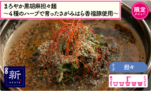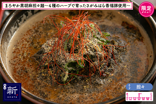 熱海の名店「麺匠 うえ田」出身の新野店主の得意ジャンルは担々麺◎スパイスを数種類合わせたゴマダレにこだわりの自家製ラー油を使用。今回はイベント限定メニューとして、地元・相模原の香福豚(こうふくとん)を使った豚骨清湯ベースのスープにたっぷりな胡麻を加えオリジナル担々麺を完成♪リッチでスパイシーな担々麺を食べて心もカラダもARATAな私に生まれ変わろう♥