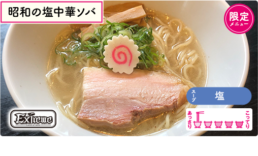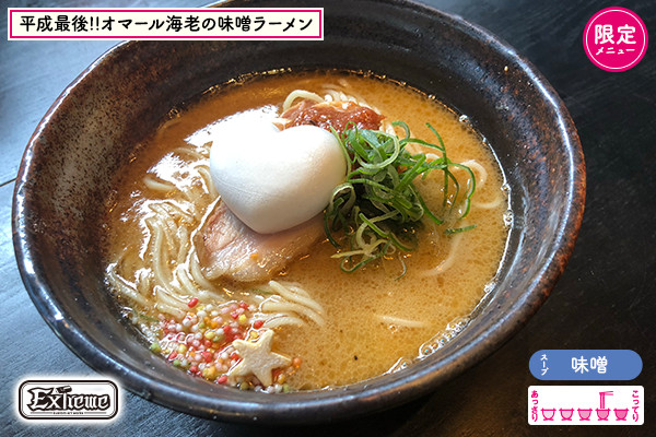 女子博初のトリプルコラボが実現!「極端な」や「最高」という意味を持つチーム名が繰り出すスペシャルラーメンは、ずばり「昭和と平成」。どこか懐かしさを感じられるような昭和の塩中華ソバは、新しい元号へと時代は移っても変わらない懐かしさを和出汁で表現。また平成最後のラーメン女子博にふさわしい一杯に仕上げたい想いから、味噌ラーメンには最高級オマール海老をチョイス。インスタ映え抜群のハートのモナカを添えて和洋折衷の味噌ラーメンに♡あなたはどっち派??
