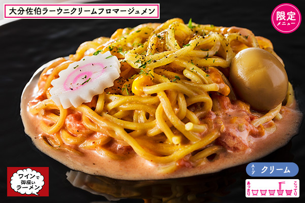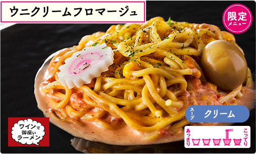 ワイン好きのラーメン店オーナーとミシュラン出身シェフが意気投合!本格フレンチのレシピを用いたウニクリームフロマージュを開発。隠し味にはトマトの酸味をほんの少し♡ 汁なしラーメンではありますが、トッピングにはウズラの玉子やナルトを乗せラーメンらしさも演出♪ 横浜の老舗海苔問屋で出川哲郎さんのご実家でもある「蔦金商店」さんの「元気のりのり」がオススメトッピング★女子ウケまちがいなしのマリアージュラーメンをお楽しみに♥